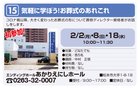 今年、株式会社みらい葬祭で初出店させて頂くことになりました。まちゼミって何?という方もいらっしゃると思います。まちゼミとは、松本市の中心地のお店の人が講師となって、専門店ならではの専門的知識や情報、コツを無料で教えてもらえる講座です。みらい葬祭では、エンディングホールあかりえにしホールで『気軽に学ぼう!お葬式のあれこれ』をテーマに講座を開きます。